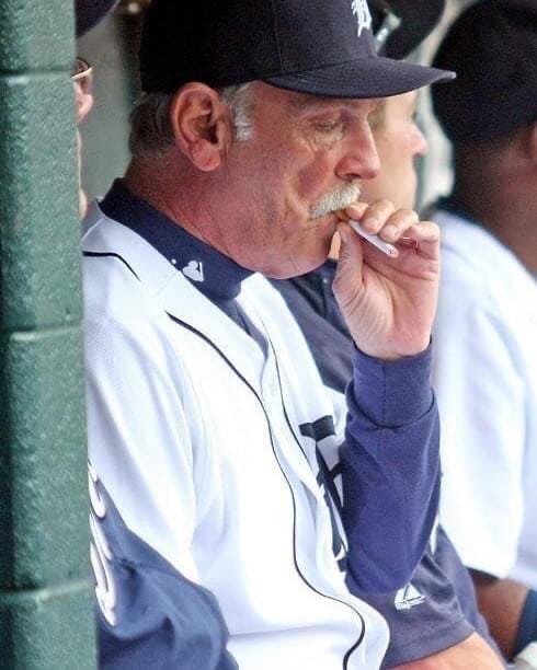 (Jim Leyland having a “heater” in the dugout. Found on the internet. Assuming Public Domain.)